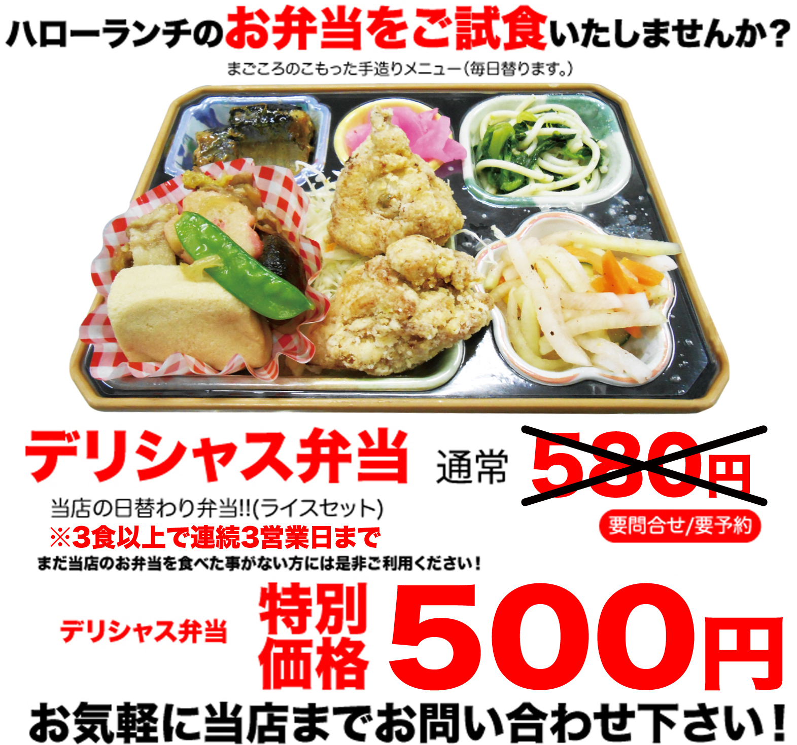 ※ デリシャス弁当の通常価格をご試食価格500円で3日間お試し頂けます。